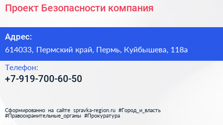 Проект Безопасности, компания по адресу 614033, Пермский край, Пермь, Куйбышева, 118а в дальнейшем Организация, размещена в следующих категориях: