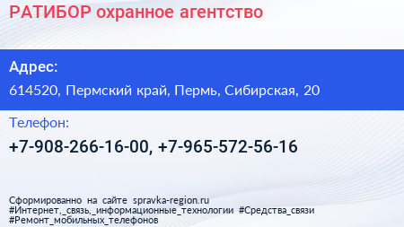 РАТИБОР, охранное агентство по адресу 614520, Пермский край, Пермь, Сибирская, 20 в дальнейшем Организация, размещена в следующих категориях: