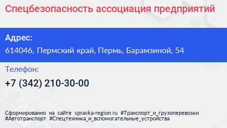 Спецбезопасность, ассоциация предприятий по адресу 614046, Пермский край, Пермь, Барамзиной, 54 в дальнейшем Организация, размещена в следующих категориях: