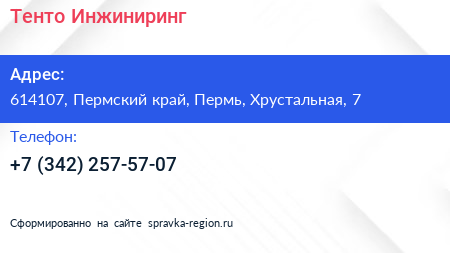 Тенто Инжиниринг по адресу 614107, Пермский край, Пермь, Хрустальная, 7 в дальнейшем Организация, размещена в следующих категориях: