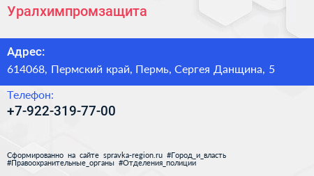 Уралхимпромзащита по адресу 614068, Пермский край, Пермь, Сергея Данщина, 5 в дальнейшем Организация, размещена в следующих категориях: