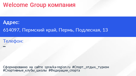 Welcome Group, компания по адресу 614097, Пермский край, Пермь, Подлесная, 13 в дальнейшем Организация, размещена в следующих категориях: