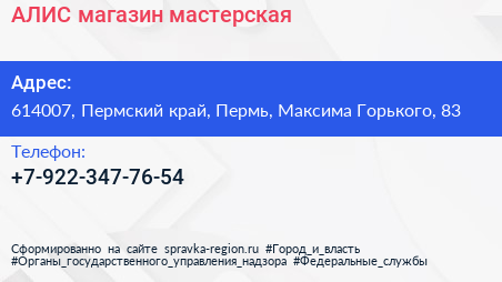 АЛИС, магазин-мастерская по адресу 614007, Пермский край, Пермь, Максима Горького, 83 в дальнейшем Организация, размещена в следующих категориях: