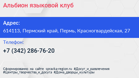 Альбион, языковой клуб по адресу 614113, Пермский край, Пермь, Красногвардейская, 27 в дальнейшем Организация, размещена в следующих категориях: