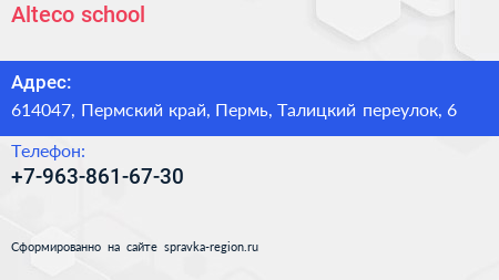 Alteco-school по адресу 614047, Пермский край, Пермь, Талицкий переулок, 6 в дальнейшем Организация, размещена в следующих категориях:
