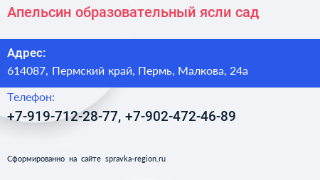 Апельсин, образовательный ясли-сад по адресу 614087, Пермский край, Пермь, Малкова, 24а в дальнейшем Организация, размещена в следующих категориях: