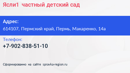Ясли1+, частный детский сад по адресу 614107, Пермский край, Пермь, Макаренко, 14а в дальнейшем Организация, размещена в следующих категориях: