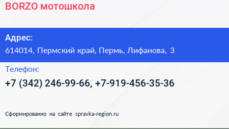 BORZO, мотошкола по адресу 614014, Пермский край, Пермь, Лифанова, 3 в дальнейшем Организация, размещена в следующих категориях: