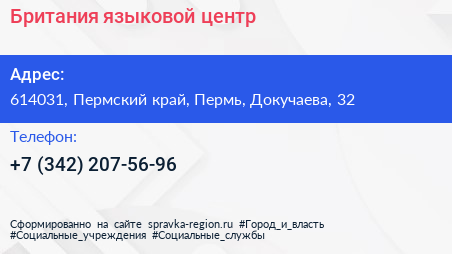 Британия, языковой центр по адресу 614031, Пермский край, Пермь, Докучаева, 32 в дальнейшем Организация, размещена в следующих категориях: