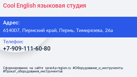 Cool English, языковая студия по адресу 614007, Пермский край, Пермь, Тимирязева, 26а в дальнейшем Организация, размещена в следующих категориях: