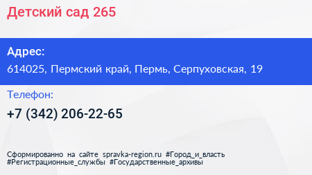 Детский сад №265 по адресу 614025, Пермский край, Пермь, Серпуховская, 19 в дальнейшем Организация, размещена в следующих категориях: