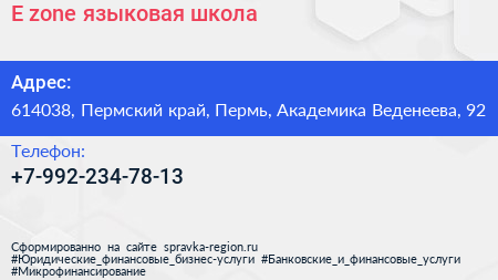 E-zone, языковая школа по адресу 614038, Пермский край, Пермь, Академика Веденеева, 92 в дальнейшем Организация, размещена в следующих категориях:
