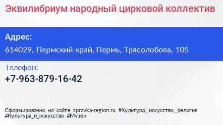 Эквилибриум, народный цирковой коллектив по адресу 614029, Пермский край, Пермь, Трясолобова, 105 в дальнейшем Организация, размещена в следующих категориях: