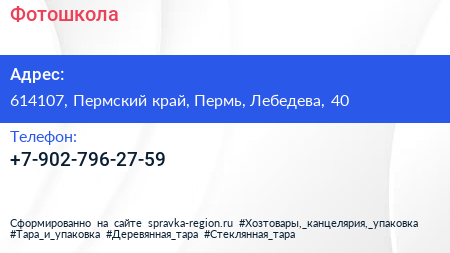 Фотошкола по адресу 614107, Пермский край, Пермь, Лебедева, 40 в дальнейшем Организация, размещена в следующих категориях: