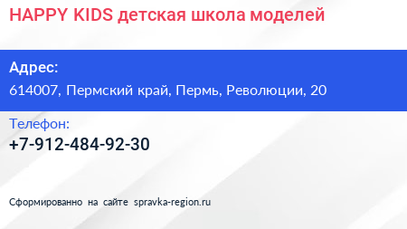 HAPPY KIDS, детская школа моделей по адресу 614007, Пермский край, Пермь, Революции, 20 в дальнейшем Организация, размещена в следующих категориях: