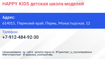 HAPPY KIDS, детская школа моделей по адресу 614015, Пермский край, Пермь, Монастырская, 12 в дальнейшем Организация, размещена в следующих категориях: