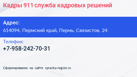Кадры 911, служба кадровых решений по адресу 614094, Пермский край, Пермь, Связистов, 24 в дальнейшем Организация, размещена в следующих категориях:
