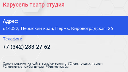 Карусель, театр-студия по адресу 614032, Пермский край, Пермь, Кировоградская, 26 в дальнейшем Организация, размещена в следующих категориях: