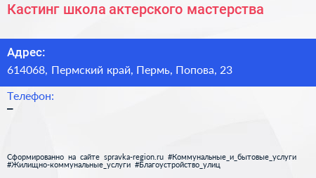 Кастинг, школа актерского мастерства по адресу 614068, Пермский край, Пермь, Попова, 23 в дальнейшем Организация, размещена в следующих категориях: