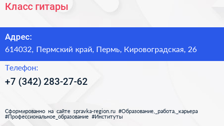 Класс гитары по адресу 614032, Пермский край, Пермь, Кировоградская, 26 в дальнейшем Организация, размещена в следующих категориях: