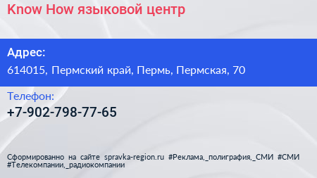 Know How, языковой центр по адресу 614015, Пермский край, Пермь, Пермская, 70 в дальнейшем Организация, размещена в следующих категориях:
