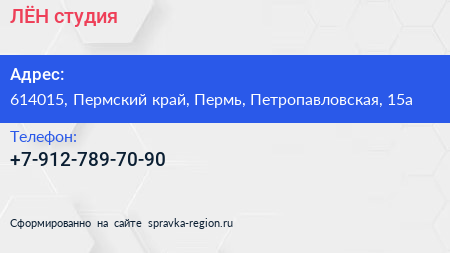 ЛЁН, студия по адресу 614015, Пермский край, Пермь, Петропавловская, 15а в дальнейшем Организация, размещена в следующих категориях: