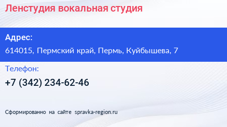 Ленстудия, вокальная студия по адресу 614015, Пермский край, Пермь, Куйбышева, 7 в дальнейшем Организация, размещена в следующих категориях: