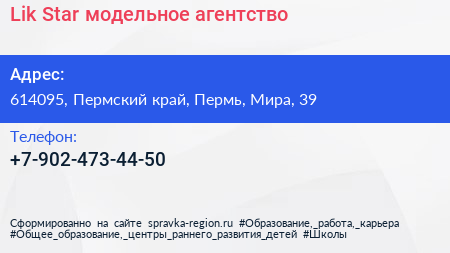 Lik Star, модельное агентство по адресу 614095, Пермский край, Пермь, Мира, 39 в дальнейшем Организация, размещена в следующих категориях: