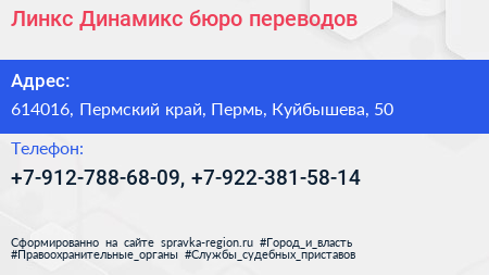 Линкс Динамикс, бюро переводов по адресу 614016, Пермский край, Пермь, Куйбышева, 50 в дальнейшем Организация, размещена в следующих категориях: