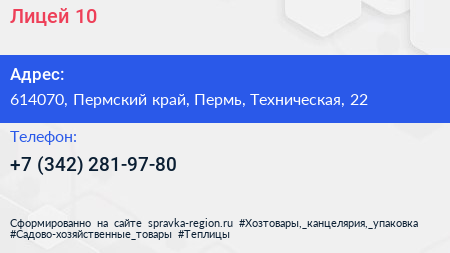 Лицей №10 по адресу 614070, Пермский край, Пермь, Техническая, 22 в дальнейшем Организация, размещена в следующих категориях: