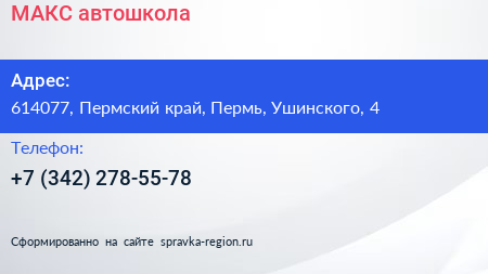 МАКС, автошкола по адресу 614077, Пермский край, Пермь, Ушинского, 4 в дальнейшем Организация, размещена в следующих категориях: