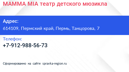MAMMA MIA, театр детского мюзикла по адресу 614109, Пермский край, Пермь, Танцорова, 7 в дальнейшем Организация, размещена в следующих категориях: