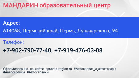 МАНДАРИН, образовательный центр по адресу 614068, Пермский край, Пермь, Луначарского, 94 в дальнейшем Организация, размещена в следующих категориях: