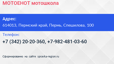 МОТОЕНОТ, мотошкола по адресу 614013, Пермский край, Пермь, Спешилова, 100 в дальнейшем Организация, размещена в следующих категориях: