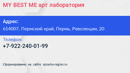 MY BEST ME, арт-лаборатория по адресу 614007, Пермский край, Пермь, Революции, 20 в дальнейшем Организация, размещена в следующих категориях:
