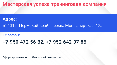 Мастерская успеха, тренинговая компания по адресу 614015, Пермский край, Пермь, Монастырская, 12а в дальнейшем Организация, размещена в следующих категориях: