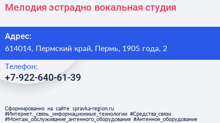Мелодия, эстрадно-вокальная студия по адресу 614014, Пермский край, Пермь, 1905 года, 2 в дальнейшем Организация, размещена в следующих категориях: