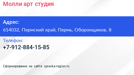 Молли, арт-студия по адресу 614032, Пермский край, Пермь, Оборонщиков, 8 в дальнейшем Организация, размещена в следующих категориях: