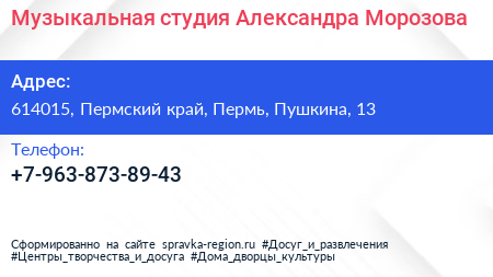 Музыкальная студия Александра Морозова по адресу 614015, Пермский край, Пермь, Пушкина, 13 в дальнейшем Организация, размещена в следующих категориях: