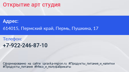 Открытие, арт-студия по адресу 614015, Пермский край, Пермь, Пушкина, 17 в дальнейшем Организация, размещена в следующих категориях: