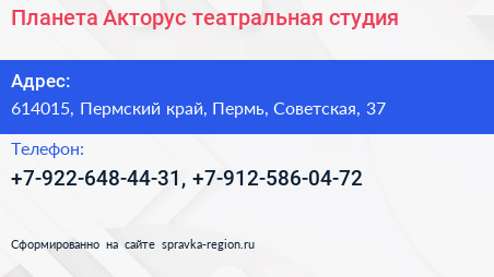 Планета Акторус, театральная студия по адресу 614015, Пермский край, Пермь, Советская, 37 в дальнейшем Организация, размещена в следующих категориях: