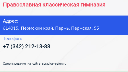 Православная классическая гимназия по адресу 614015, Пермский край, Пермь, Пермская, 55 в дальнейшем Организация, размещена в следующих категориях: