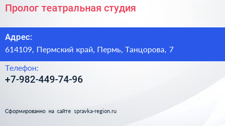 Пролог, театральная студия по адресу 614109, Пермский край, Пермь, Танцорова, 7 в дальнейшем Организация, размещена в следующих категориях: