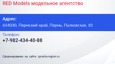 RED Models, модельное агентство по адресу 614030, Пермский край, Пермь, Пулковская, 10 в дальнейшем Организация, размещена в следующих категориях:
