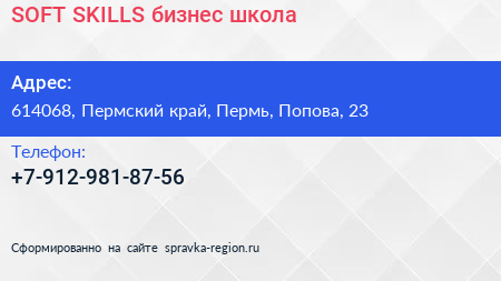 SOFT SKILLS, бизнес-школа по адресу 614068, Пермский край, Пермь, Попова, 23 в дальнейшем Организация, размещена в следующих категориях: