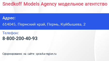 Snedkoff Models Agency, модельное агентство по адресу 614045, Пермский край, Пермь, Куйбышева, 2 в дальнейшем Организация, размещена в следующих категориях: