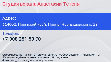 Студия вокала Анастасии Тетеля по адресу 614002, Пермский край, Пермь, Чернышевского, 28 в дальнейшем Организация, размещена в следующих категориях: