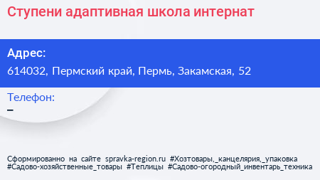 Ступени, адаптивная школа-интернат по адресу 614032, Пермский край, Пермь, Закамская, 52 в дальнейшем Организация, размещена в следующих категориях: