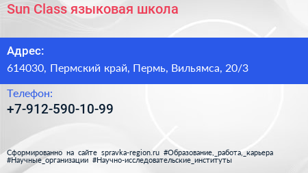 Sun Class, языковая школа по адресу 614030, Пермский край, Пермь, Вильямса, 20/3 в дальнейшем Организация, размещена в следующих категориях:
