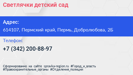 Светлячки, детский сад по адресу 614107, Пермский край, Пермь, Добролюбова, 2Б в дальнейшем Организация, размещена в следующих категориях: